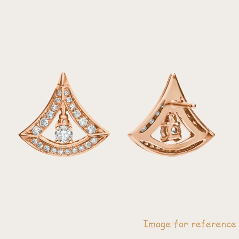 Embodying ultimate Italian elegance, the 18k rose gold earrings epitomizes the legacy of a diva, with her mysterious, unforgettable allure. Quintessentially feminine and refined, the fan-shaped motif draws inspiration from the colorful mosaics of the Roman Baths of Caracalla, reflecting JingYing integral bond with the Eternal City through the very essence of Italian beauty.JingYing 18 kt rose gold earrings with round brilliant-cut diamonds and pave diamonds (0.37 ct).